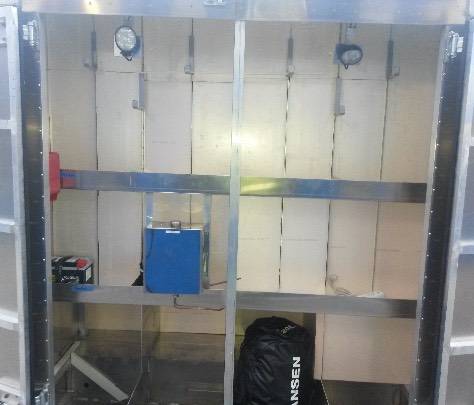 «Nødbu» for å ivareta sikkerheten til montører. Innredning for verktøy og eget oppholdsrom. Disse er utstyrt med dieseldrevet varmekilde, 230V strømaggregat + 12V DC samt godt med utvendig og innvendig belysning. Mål 2,4mx2,4m