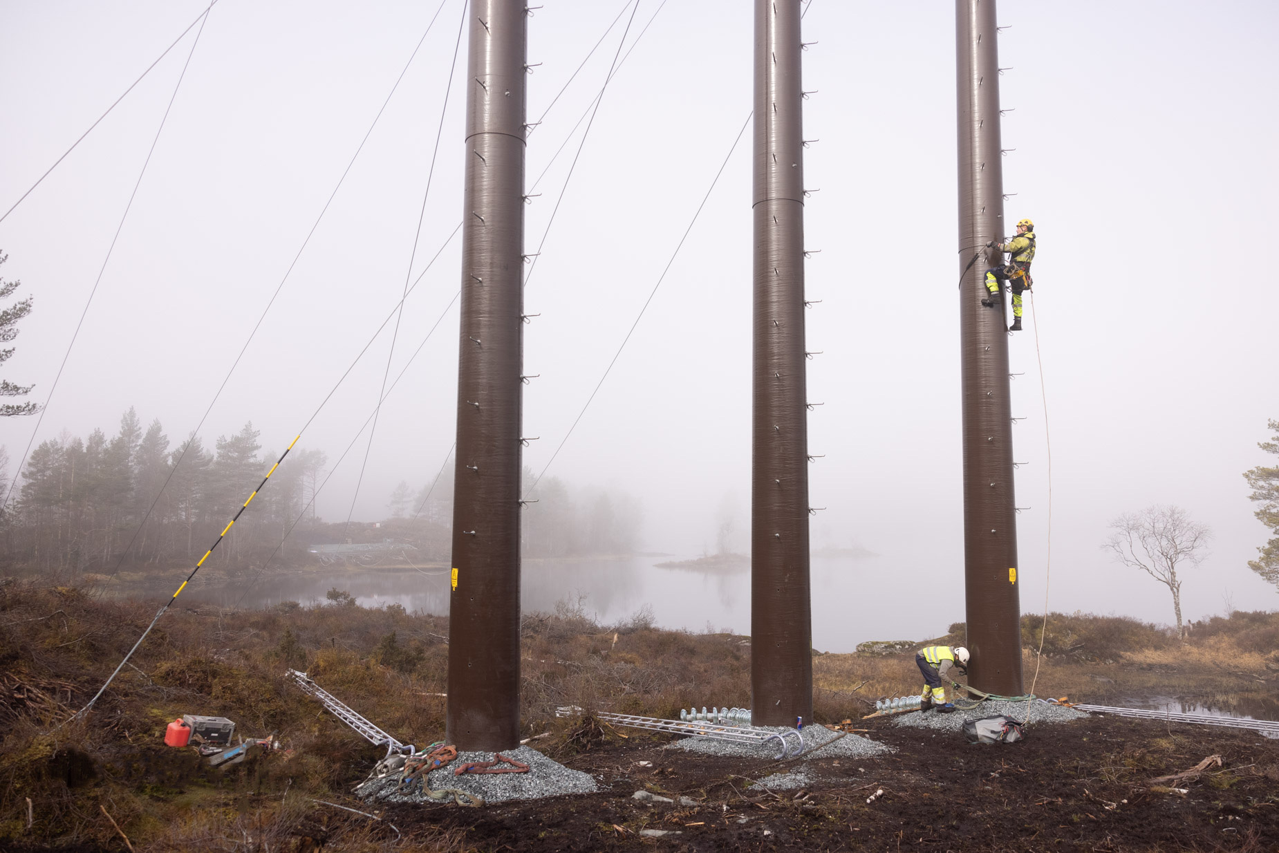 Dette er av de største ombyggingsprosjektene vi har gjennomført. I svært variert terreng, med kryssing av fjorder, verneverdige områder, rasfarlige områder og lange distanser fikk vi utfordringer på rekke og rad. Det liker vi. Prosjektet innebar ombygging av 2 stk 132 kV prosjekter på til sammen 130 km. Vi satte opp nybygg og rev gamle installasjoner. Det ble montert tung ledning (FeAI 240) med tremaster, kabelstativer og endeavslutninger. Og deler av anlegget ble utført som jordkabel i tettbebyggelse og ved kryssing av flyplass. Vi gjennomførte idriftsettelse av hele anlegget – uført i ulike seksjoner. Dette prosjektet ble gjennomført på en effektiv og sikker måte, takket være dyktige ledere, montører, underentreprenører, leverandører og kunde.